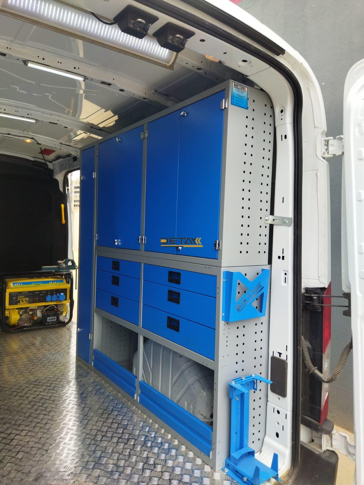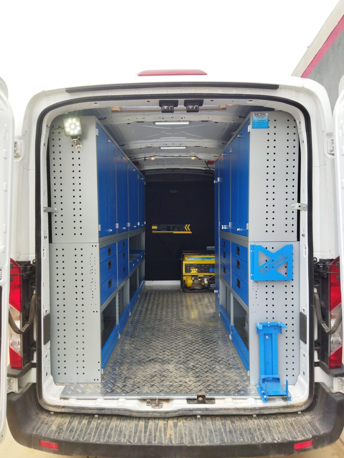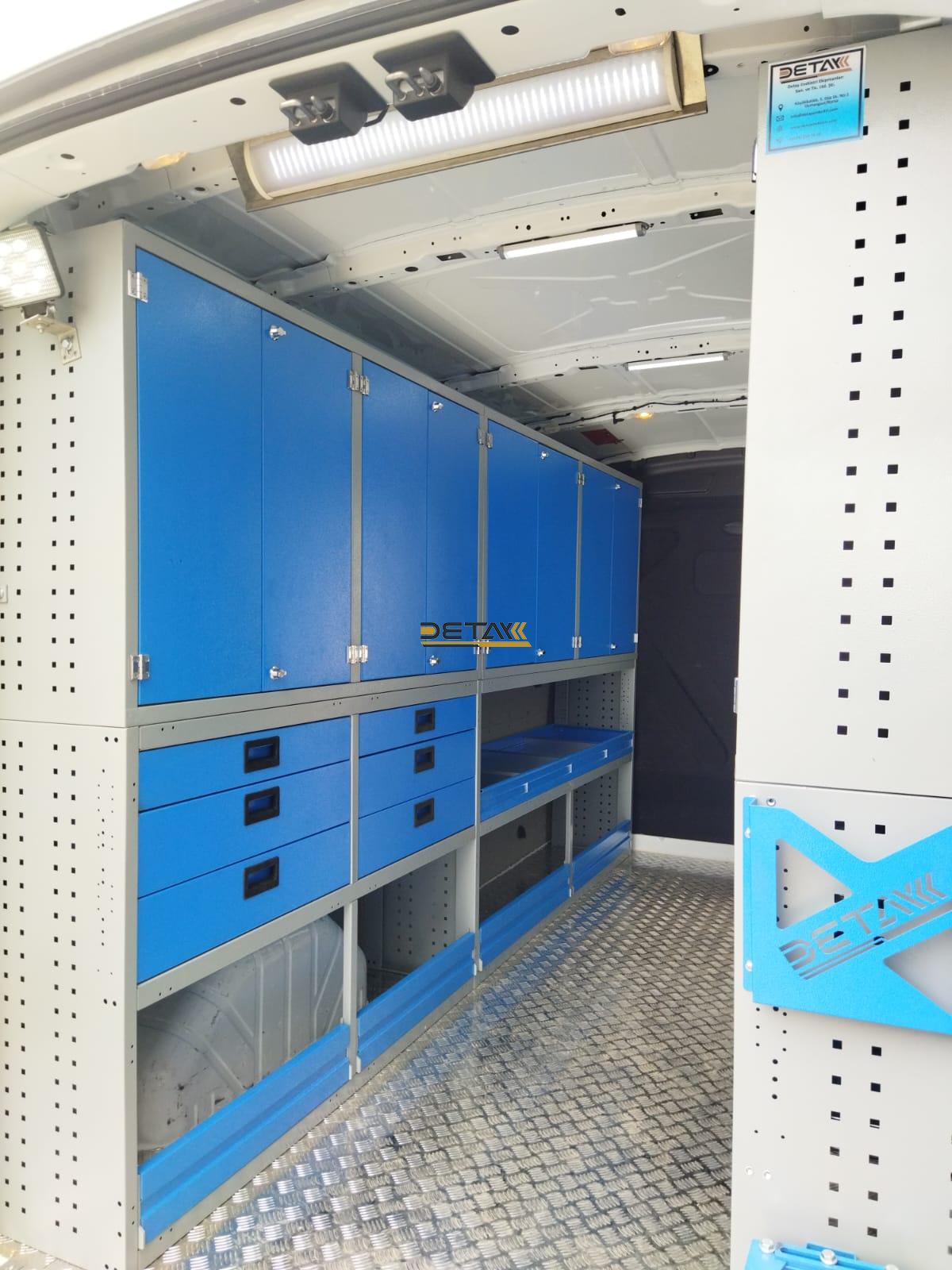 Bakım onarım için kullandığınız Ford Transit Doğalgaz Bakım Aracı 3’ün iç kısımları modüler raf çekmeceli dolap ve çalışma tezgahları ile donatılarak gezici bir servis aracına bir nevi seyyar atölyeye dönüştürülmektedir.