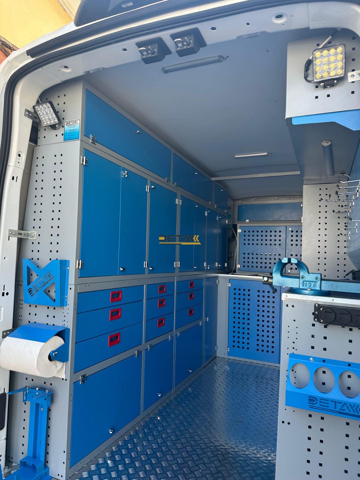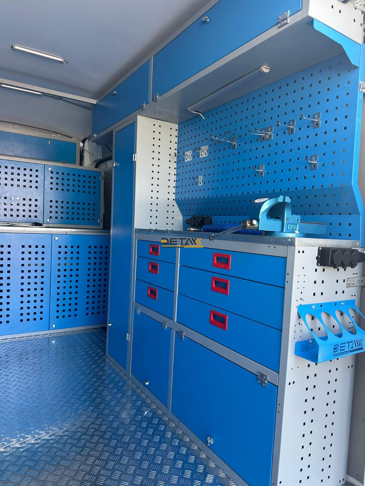Bakım onarım için kullandığınız Esenler Belediyesi Mobil Servis Aracı’nın iç kısımları modüler raf çekmeceli dolap ve çalışma tezgahları ile donatılarak gezici bir servis aracına bir nevi seyyar atölyeye dönüştürülmektedir.