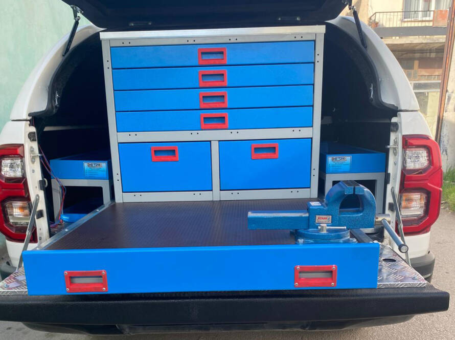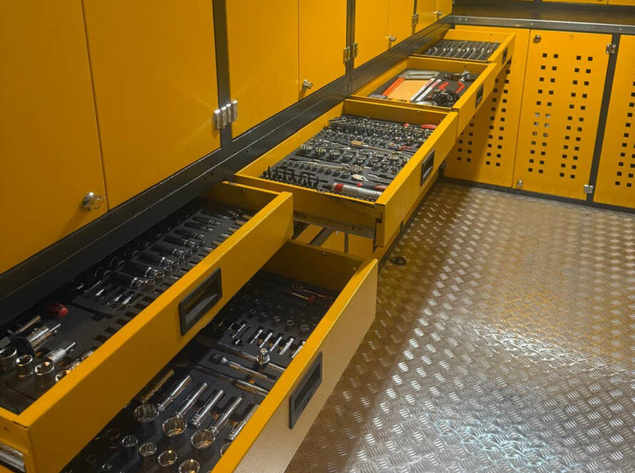 Dolaplar araç gövdesine çok noktalı bağlantı ile sabitlenir; ağırlık merkezine dikkat edilerek devrilme riski ortadan kaldırılır.