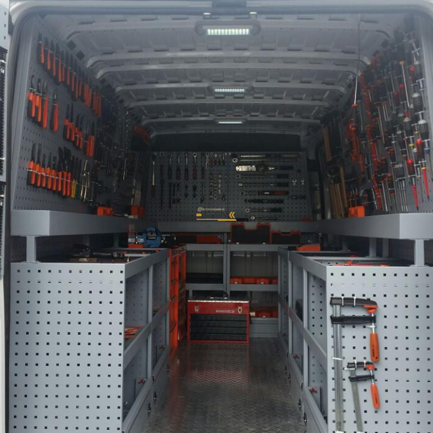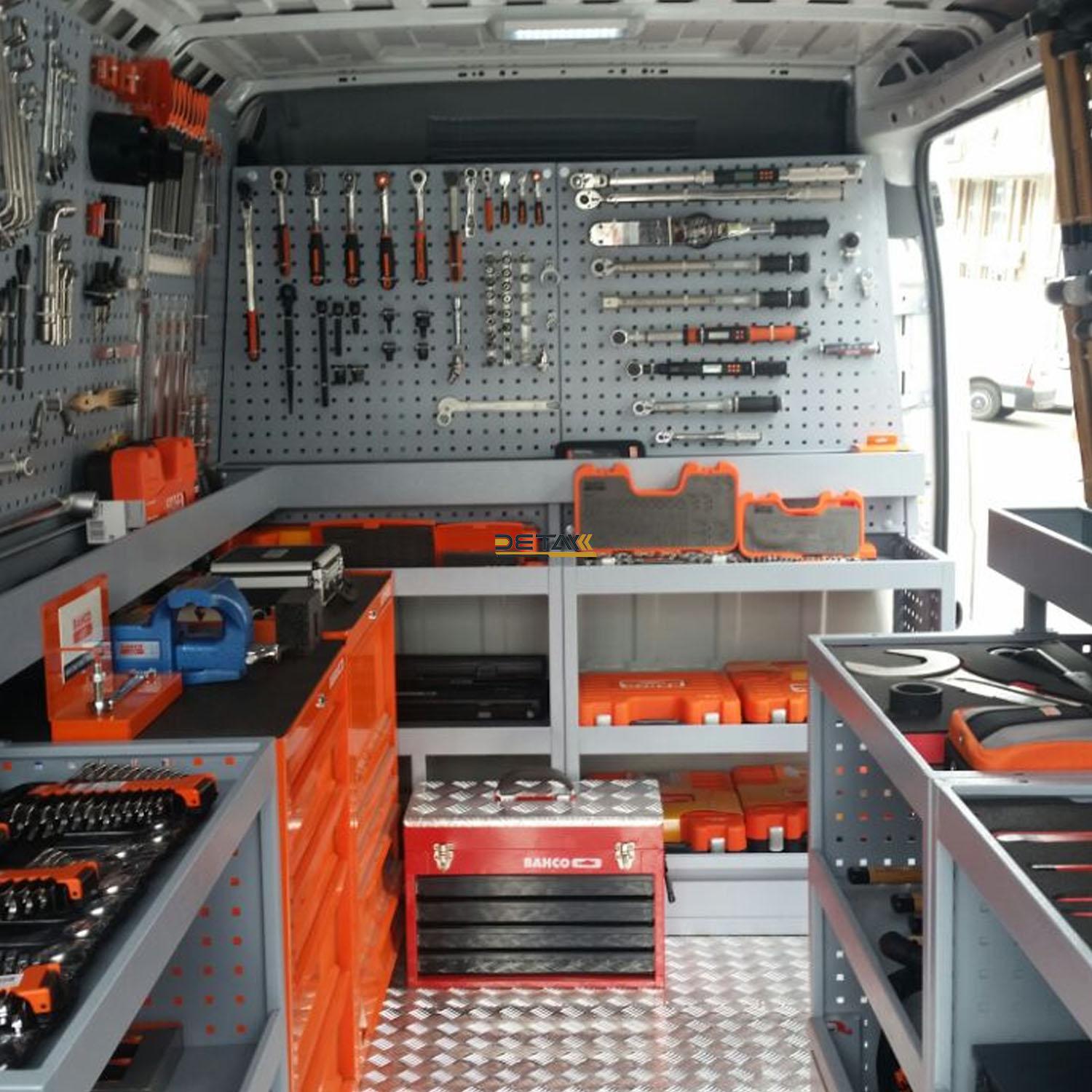 The interiors of the vehicles you use for maintenance and repair are equipped with modular shelves, cabinets and work benches, and they are transformed into a mobile service vehicle, a kind of mobile workshop.