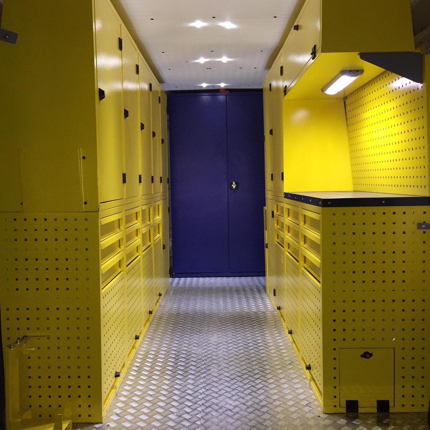 The interiors of the vehicles you use for maintenance and repair are equipped with modular shelves, cabinets and work benches, and they are transformed into a mobile service vehicle, a kind of mobile workshop.