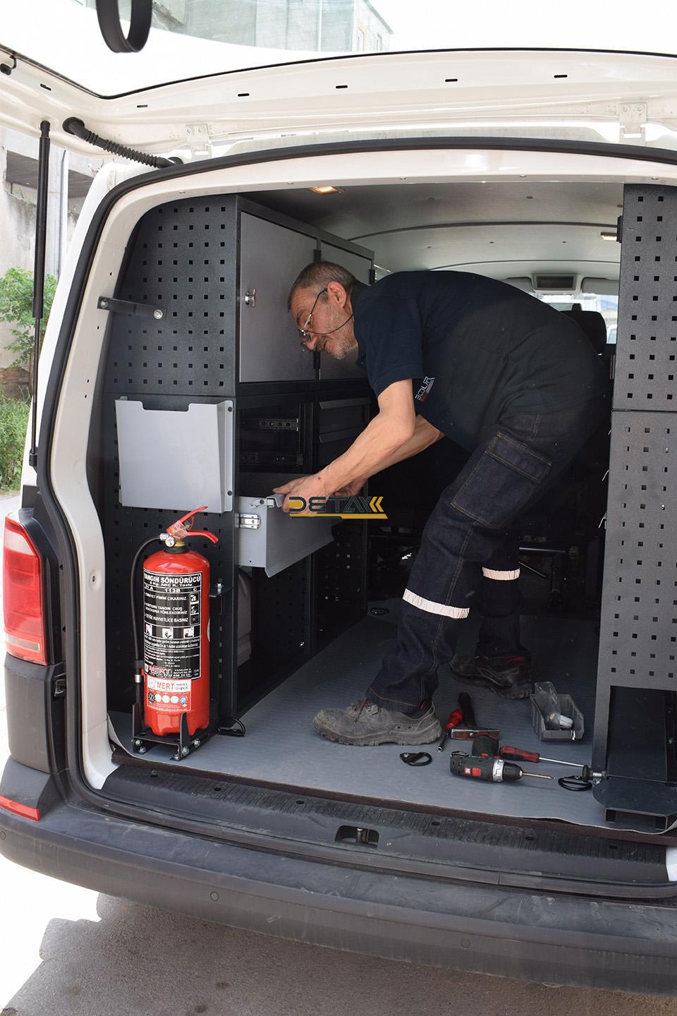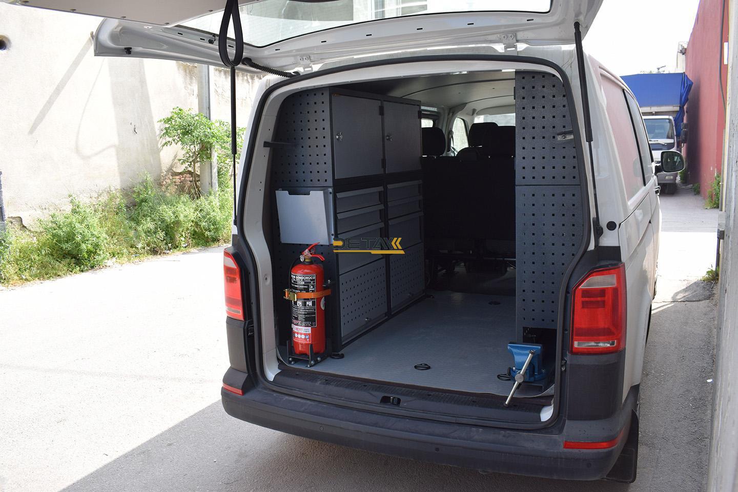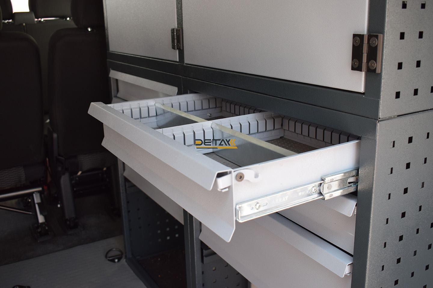 The interiors of the vehicles you use for maintenance and repair are equipped with modular shelves, cabinets and work benches, and they are transformed into a mobile service vehicle, a kind of mobile workshop.