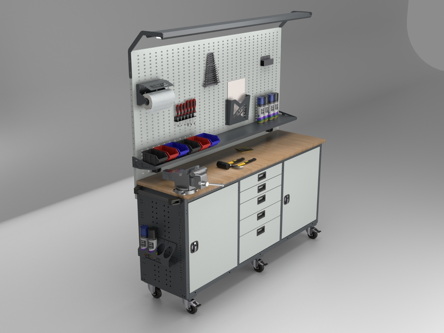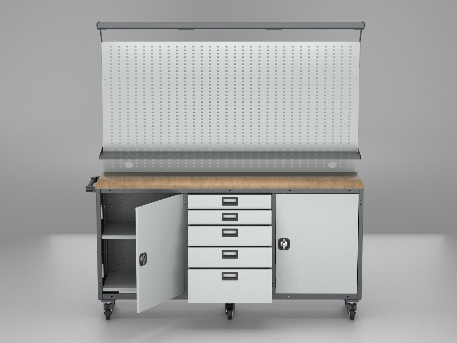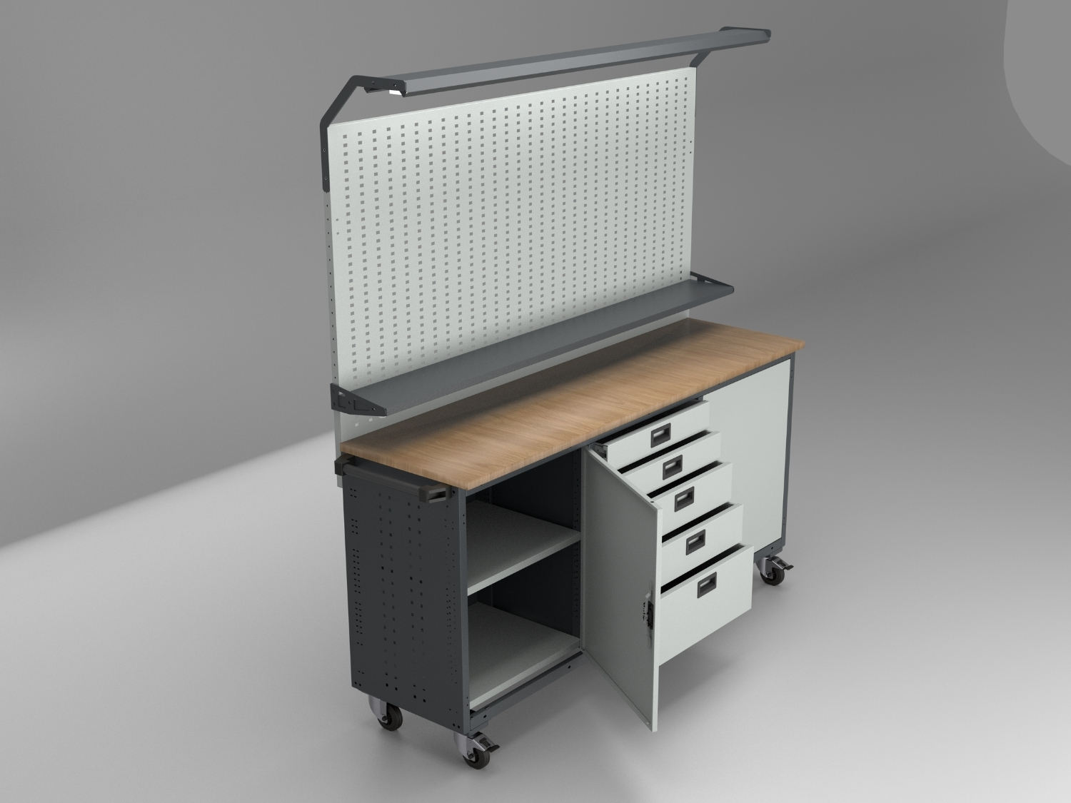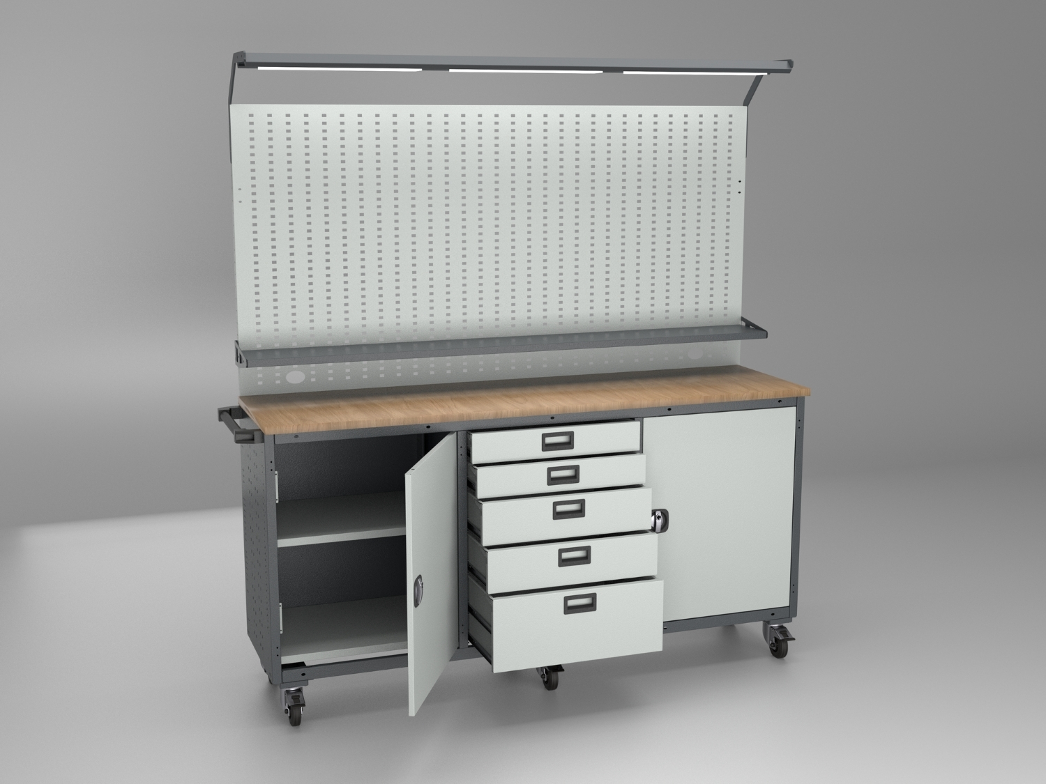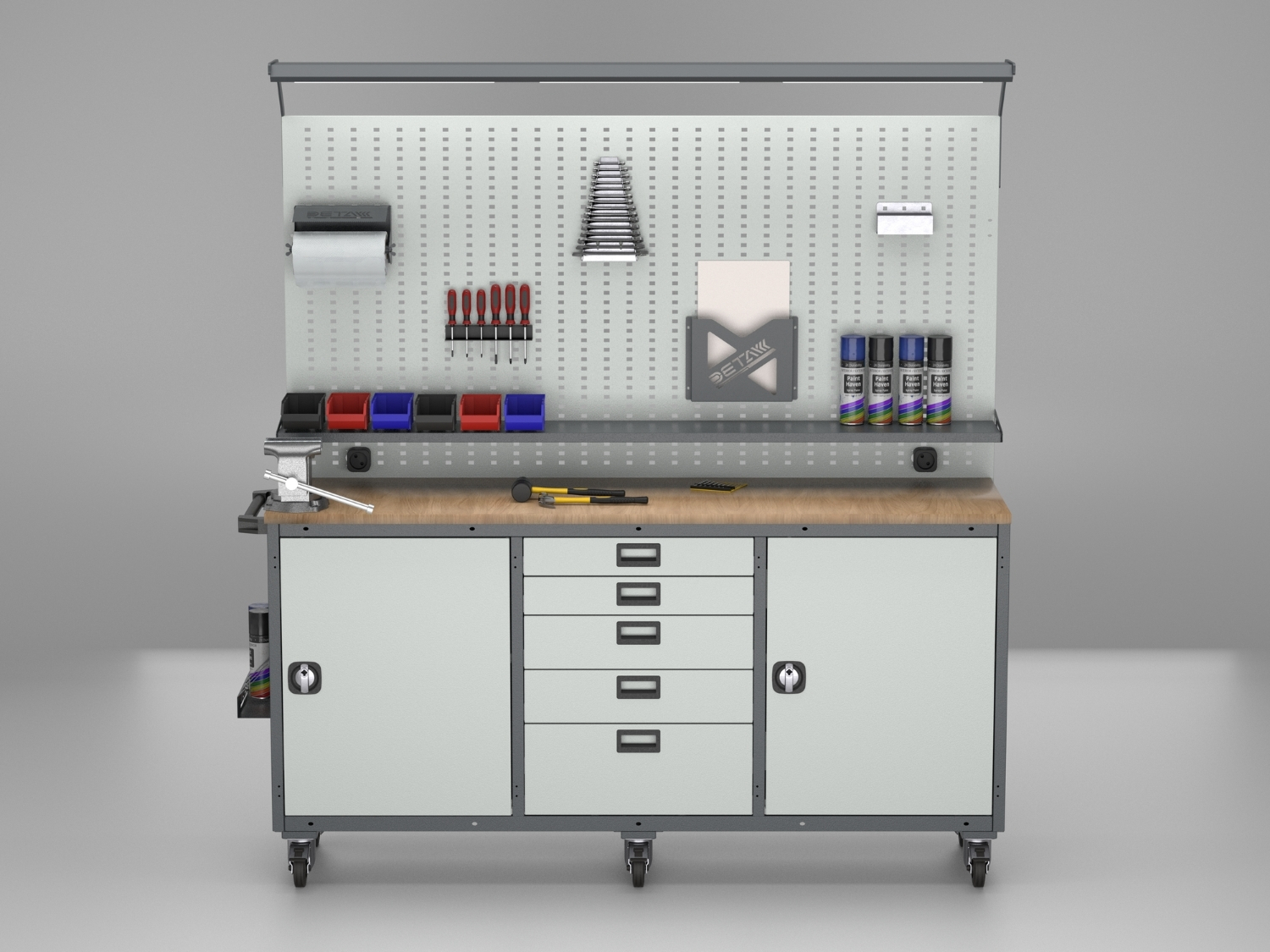 Its DKP sheet metal body and electrostatic powder coating provide high resistance against harsh working conditions. Thanks to its workbench-type design, it combines both a working surface and storage area, optimizing space usage. Its modular structure offers flexible usage to adapt to different needs.