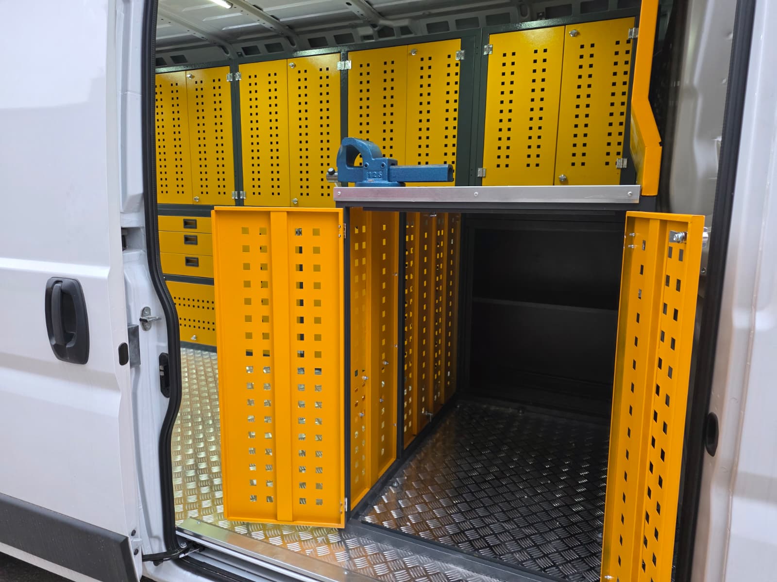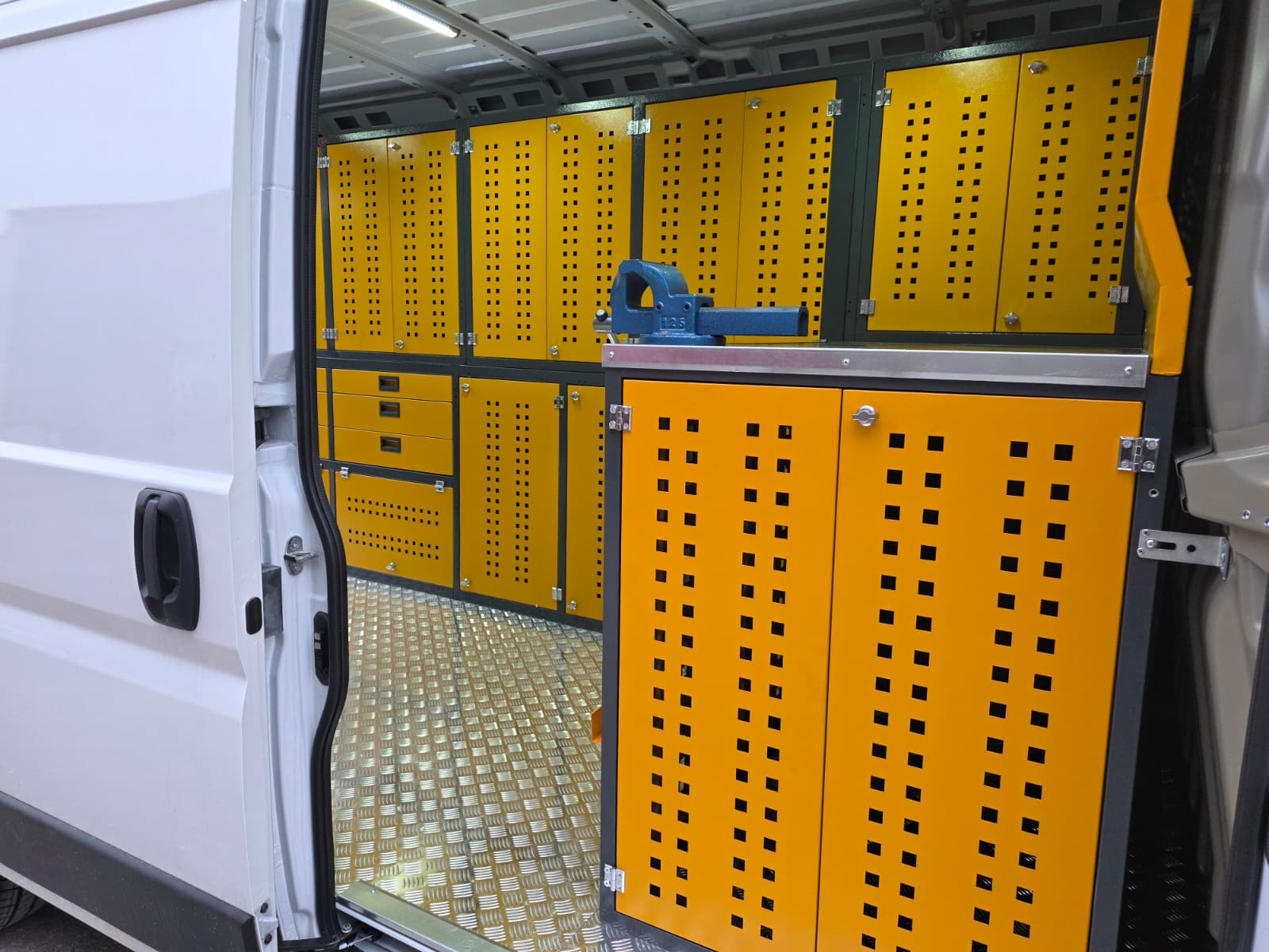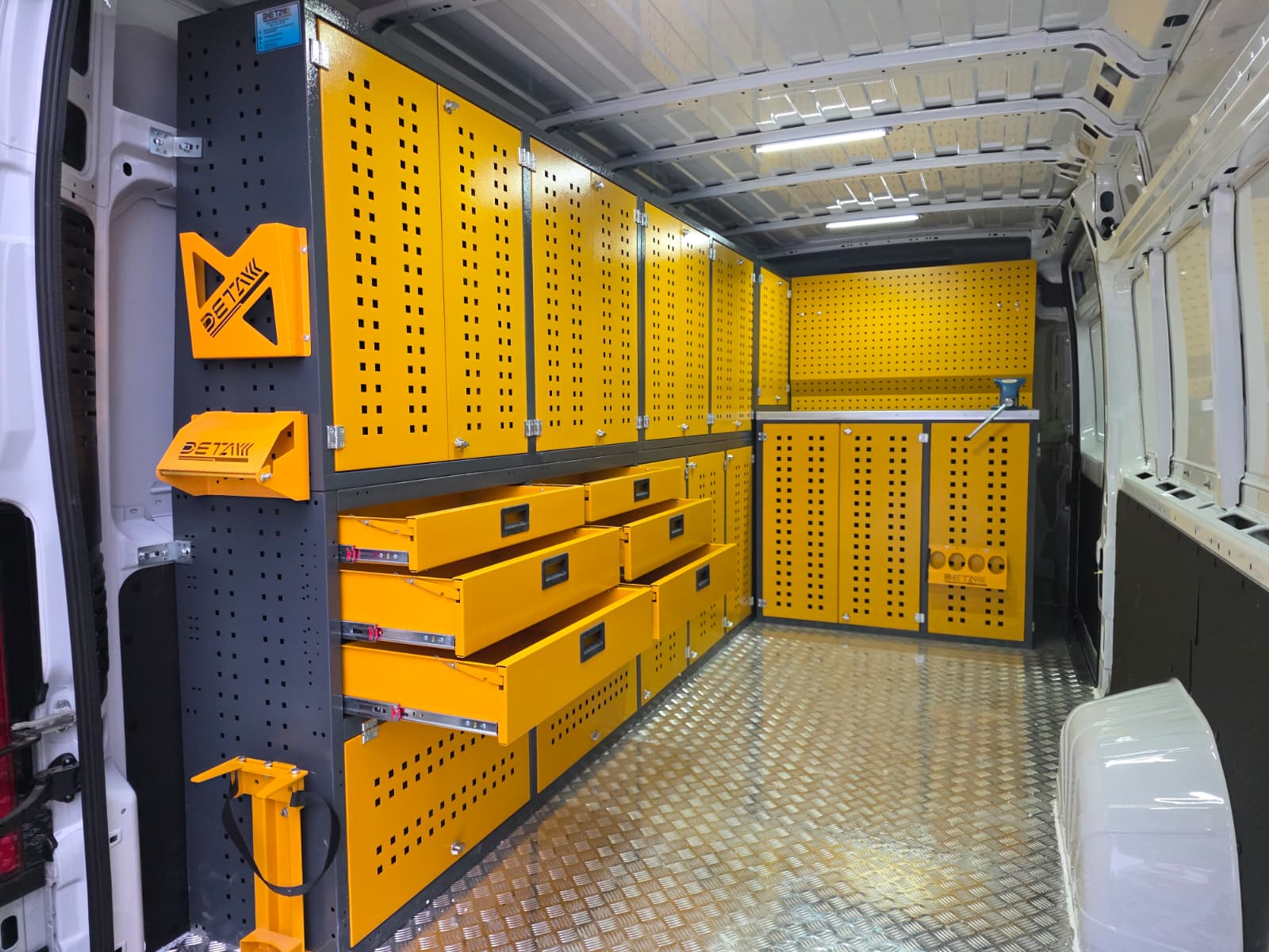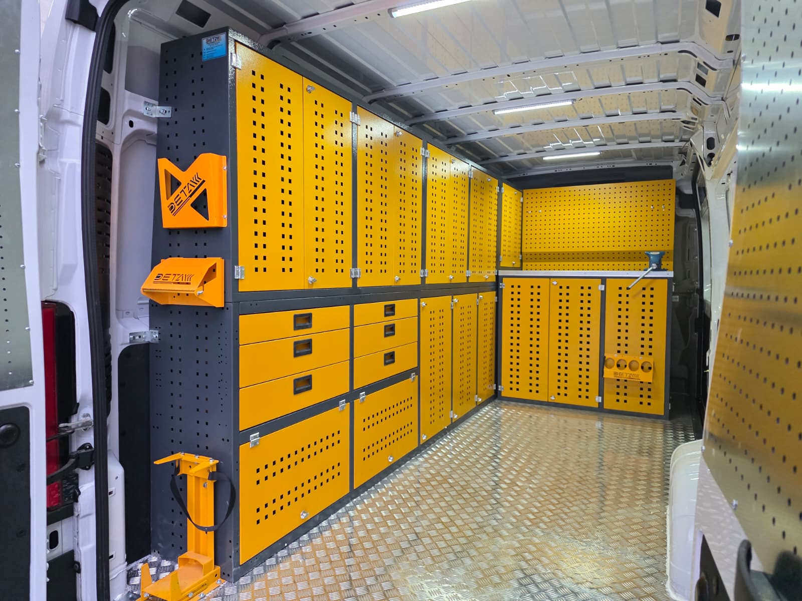 The interior of the Fıat Ducato vehicle you use for maintenance and repair is equipped with modular shelving cabinets and workbenches, transforming it into a mobile service vehicle, a kind of mobile workshop.