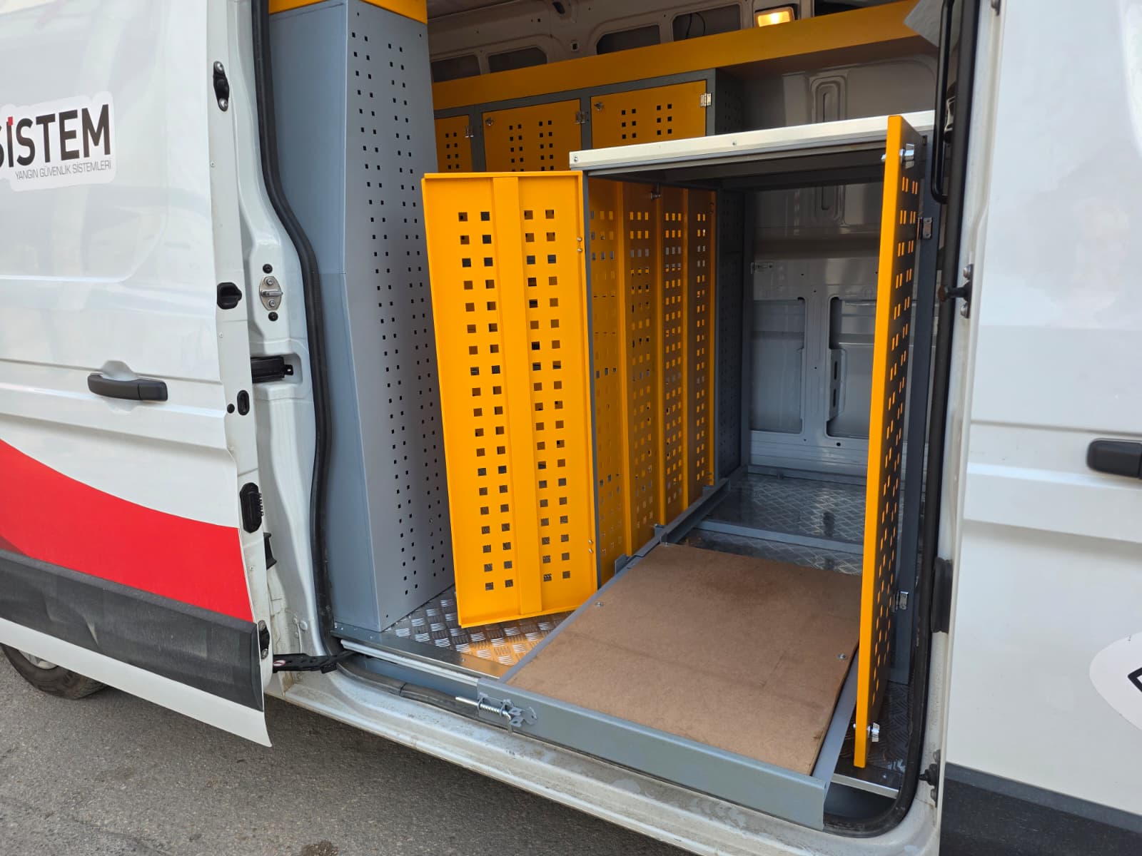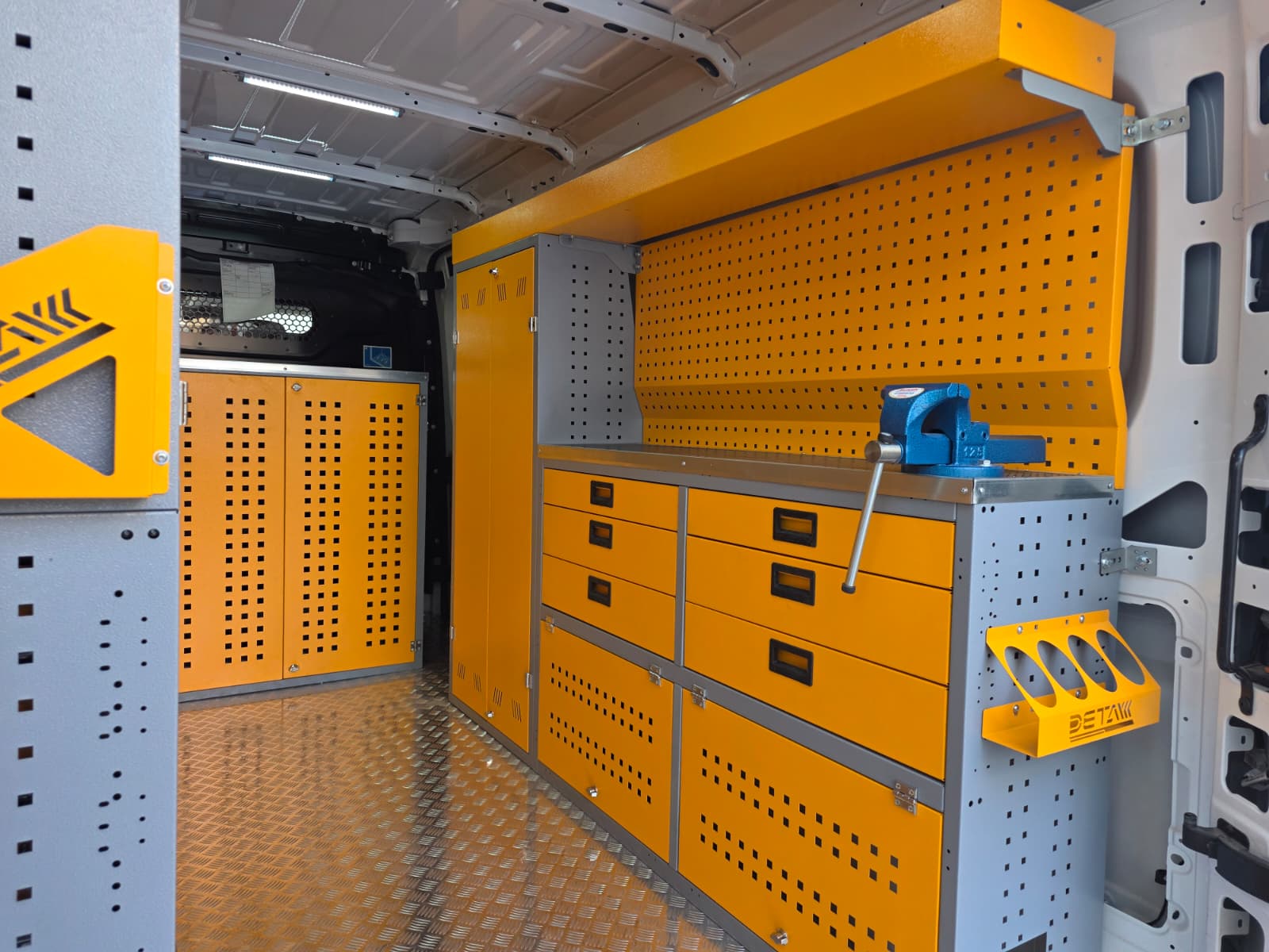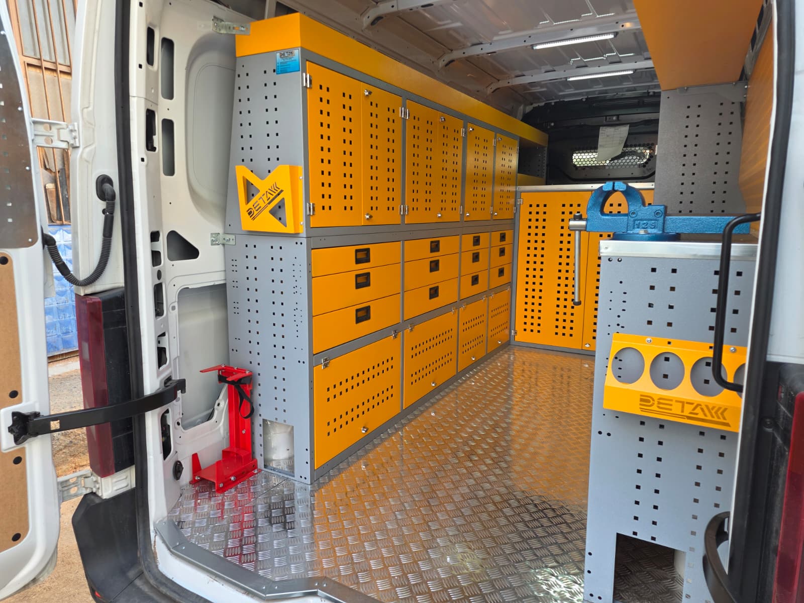 The interior of the Renault Master vehicle you use for maintenance and repair is equipped with modular shelving cabinets and workbenches, transforming it into a mobile service vehicle, a kind of mobile workshop.