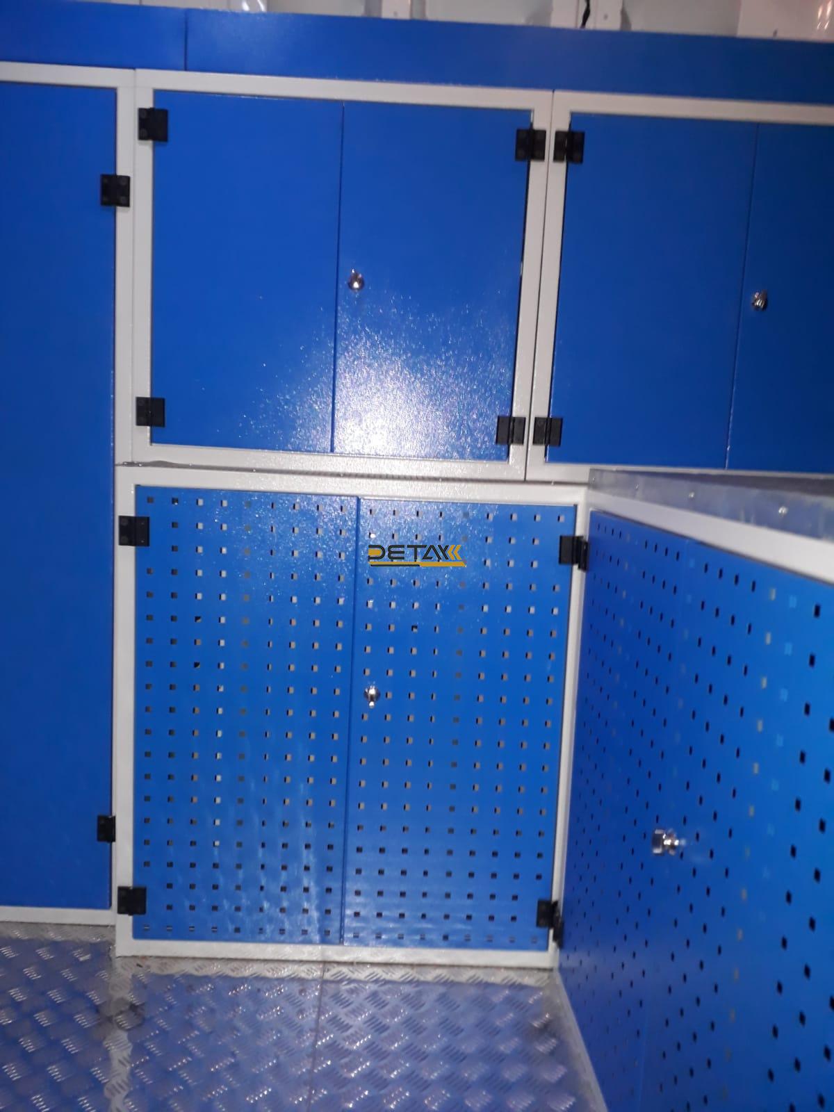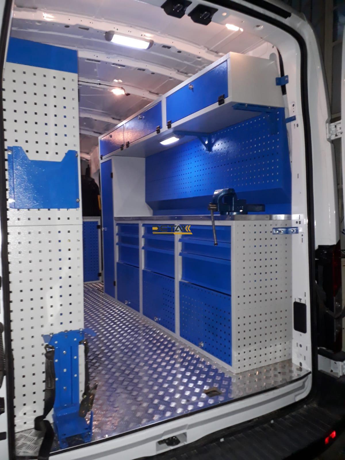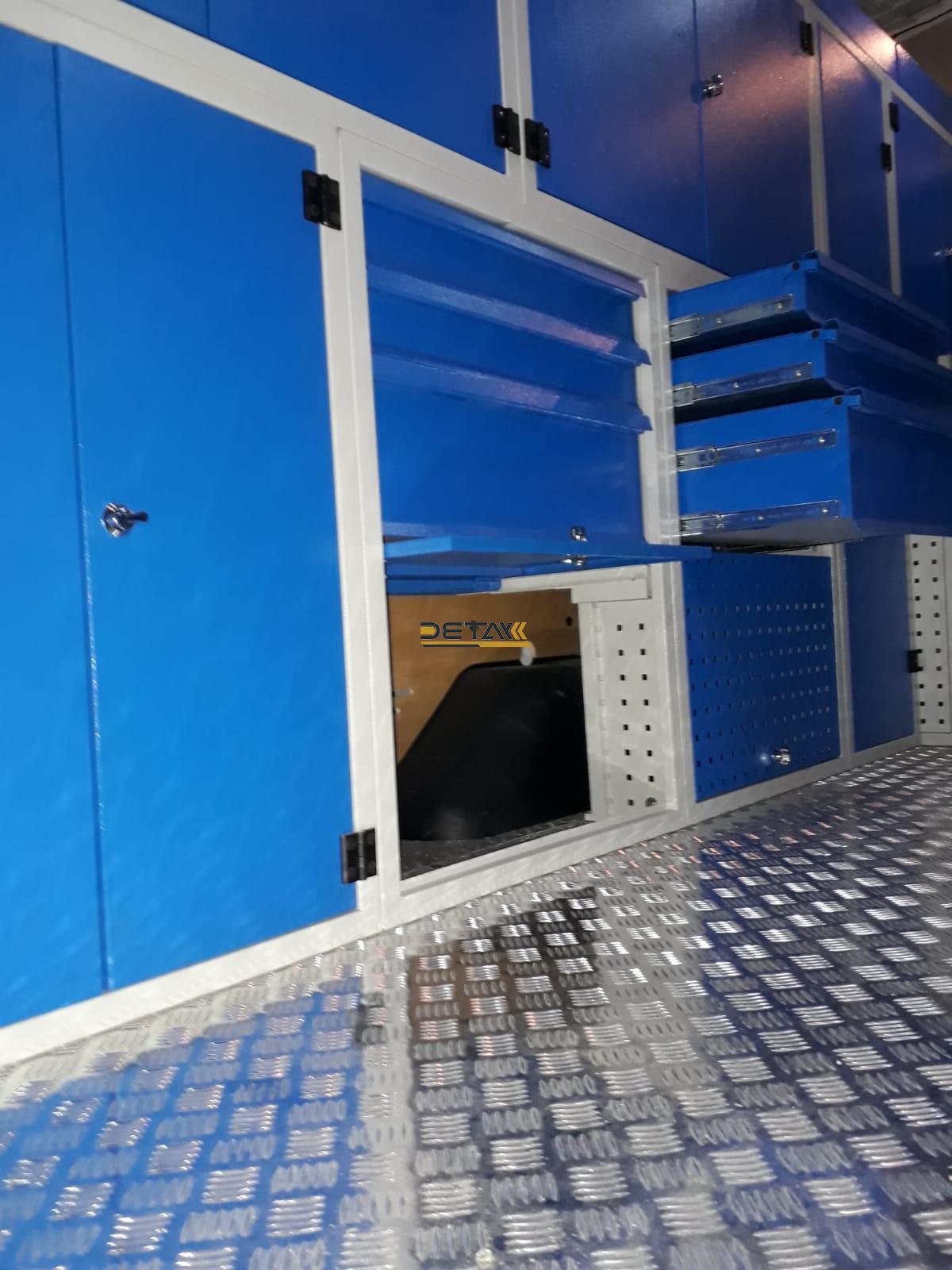 Bakım onarım için kullandığınız araçlarınızın iç kısımları modüler raf çekmeceli dolap ve çalışma tezgahları ile donatılarak gezici bir servis aracına bir nevi seyyar atölyeye dönüştürülmektedir.