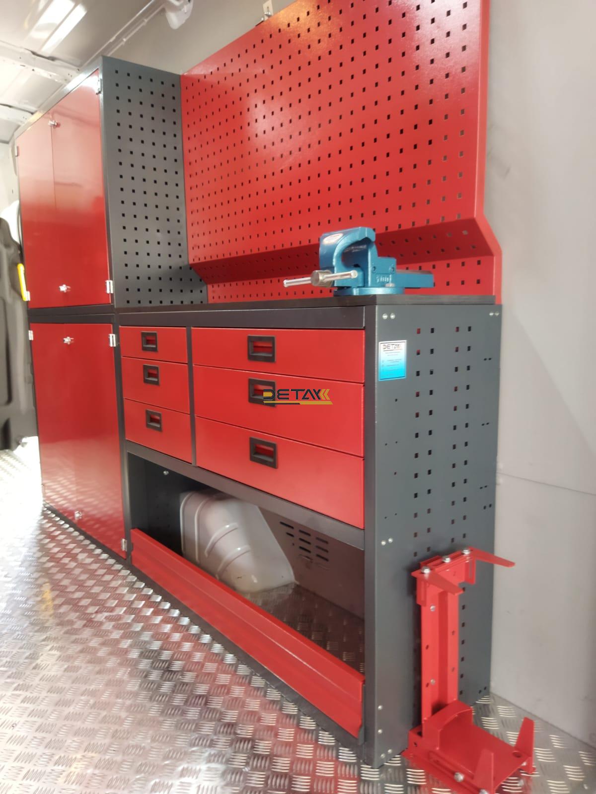 Bakım onarım için kullandığınız Ford Transit Mobil Servis Aracınızın iç kısımları modüler raf çekmeceli dolap ve çalışma tezgahları ile donatılarak gezici bir servis aracına bir nevi seyyar atölyeye dönüştürülmektedir.