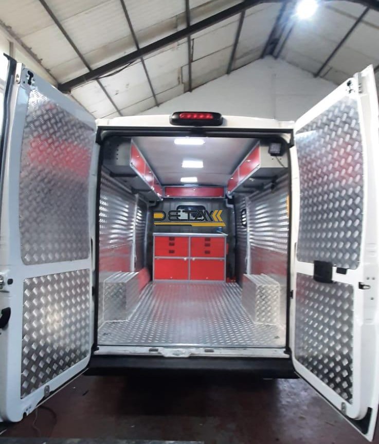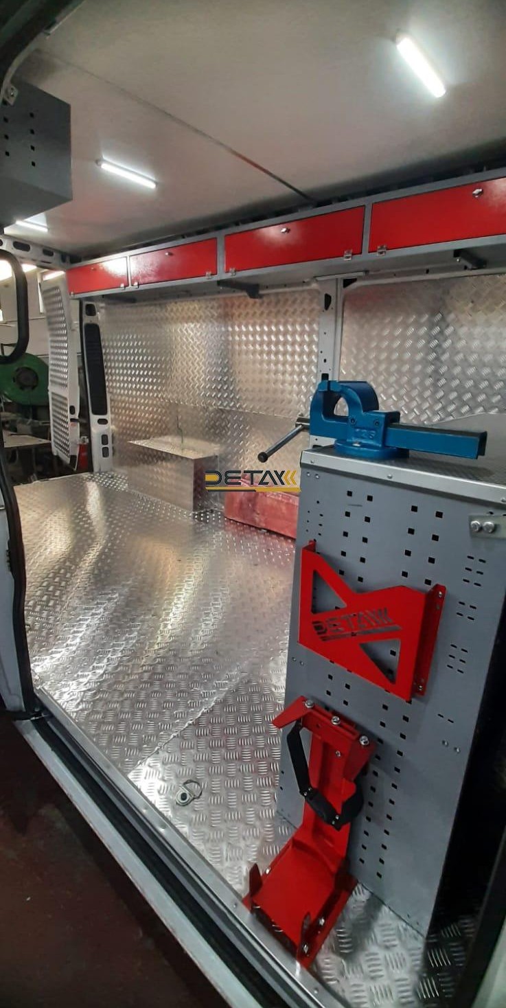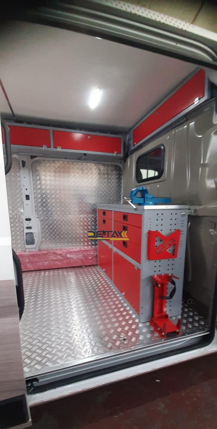Bakım onarım için kullandığınız Citroen Jumper yol yardım bakım onarım aracının iç kısımları modüler raf çekmeceli dolap ve çalışma tezgahları ile donatılarak gezici bir servis aracına bir nevi seyyar atölyeye dönüştürülmektedir.