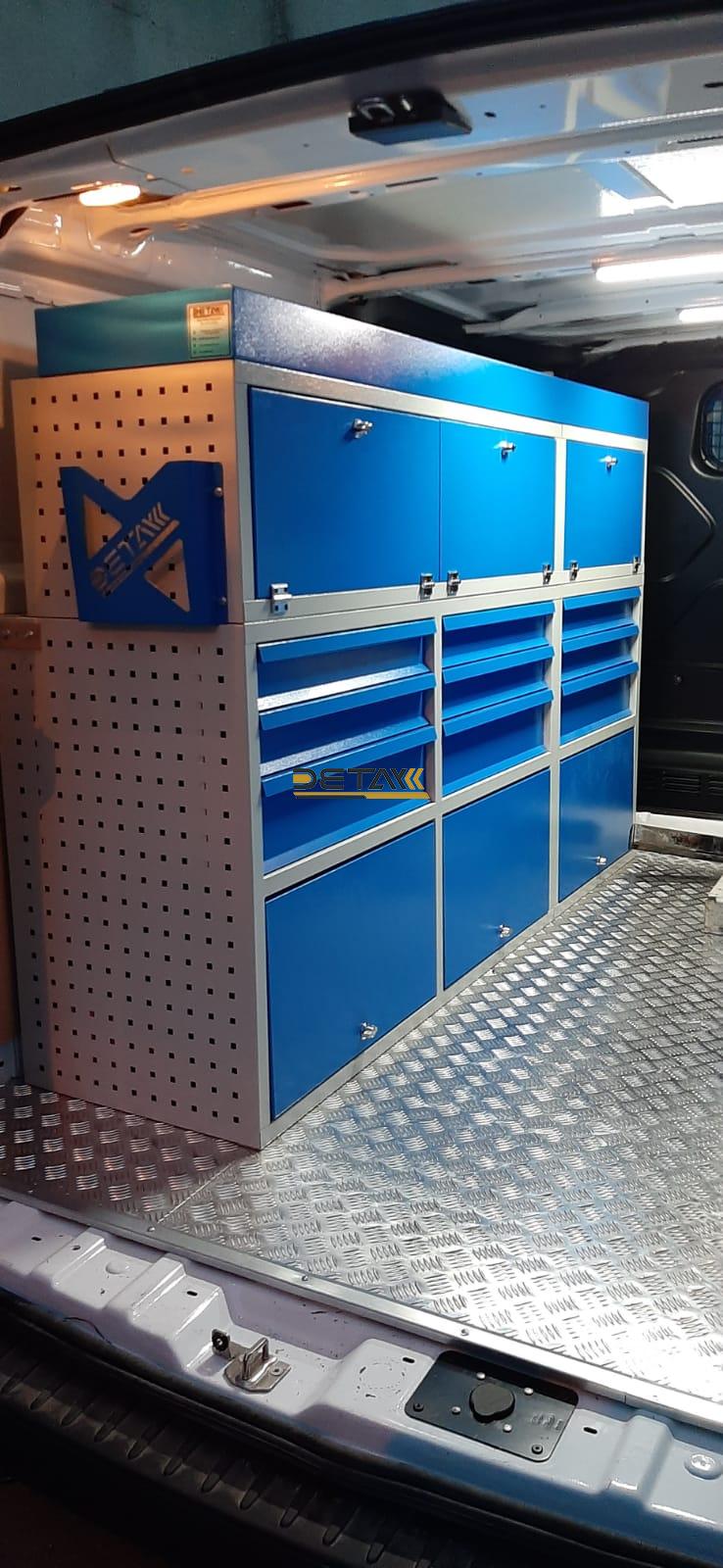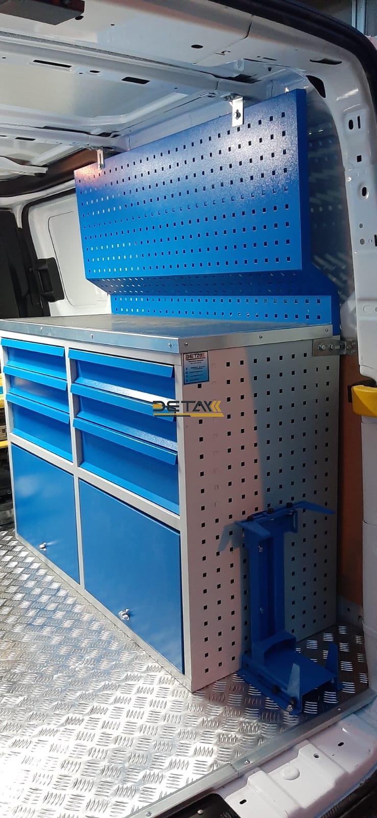 Bakım onarım için kullandığınız Ford Custom doğalgaz bakım aracınızın iç kısımları modüler raf çekmeceli dolap ve çalışma tezgahları ile donatılarak gezici bir servis aracına bir nevi seyyar atölyeye dönüştürülmektedir.