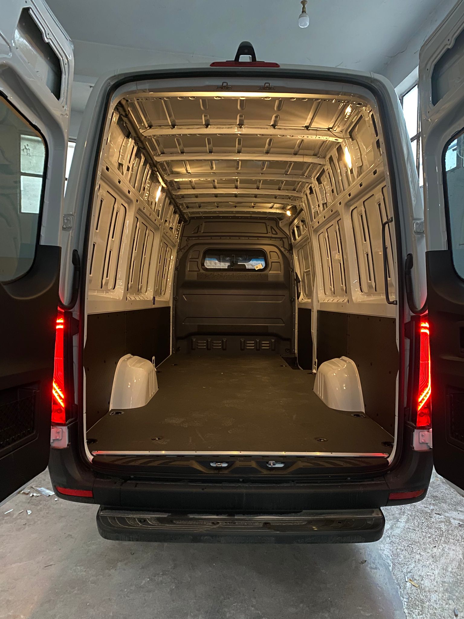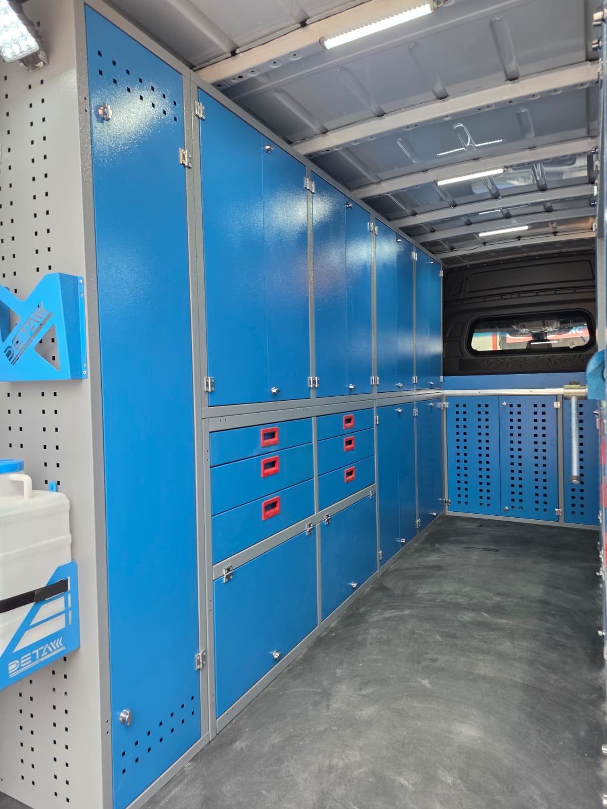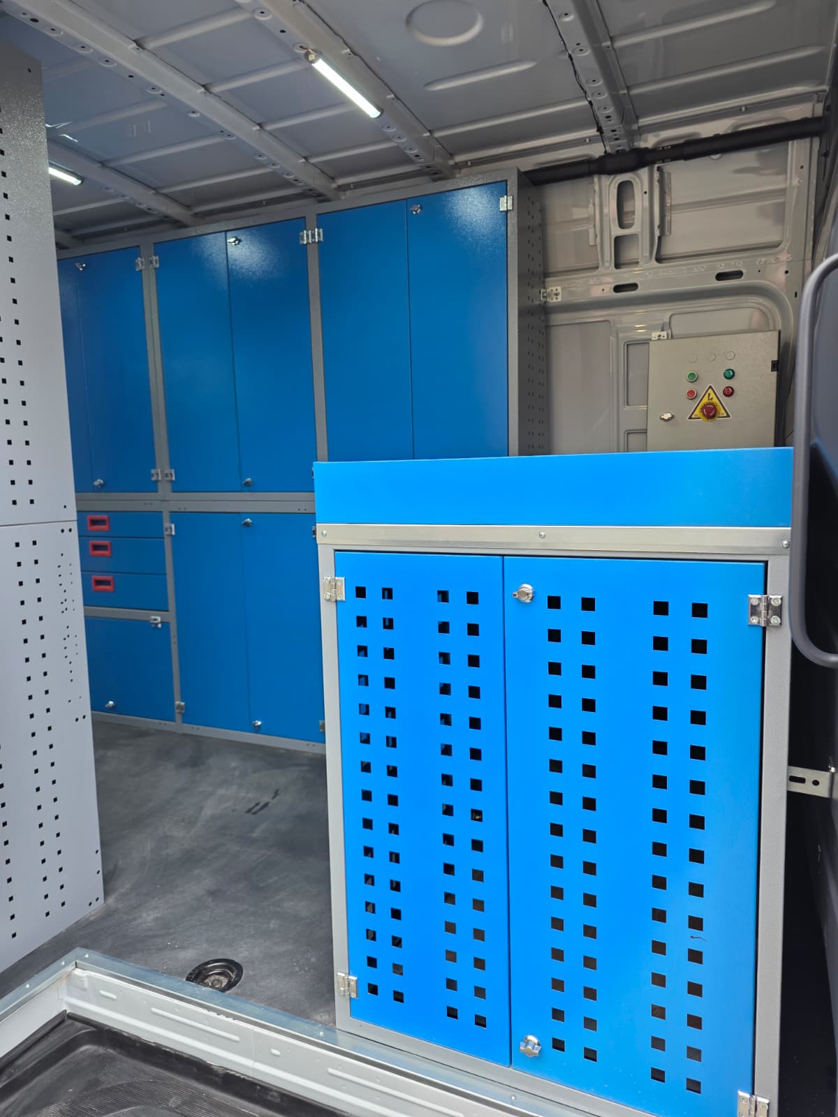 Araç zeminine isteğe göre mdf yada mdf üzeri alüminyum kaplama araç içi duvarlarına alüminyum giydirme dolap ve rafların olduğu bölümde led aydınlatma montajları yapılabilmektedir.