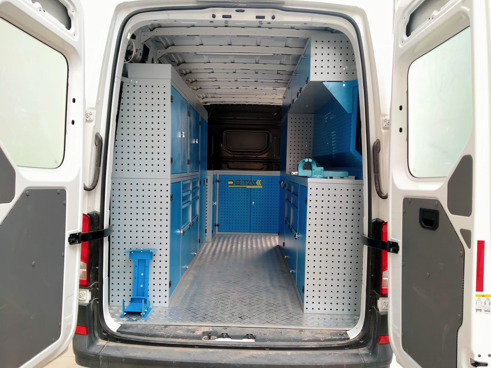 Bakım onarım için kullandığınız Volkswagen Crafter araçlarınızın iç kısımları modüler raf çekmeceli dolap ve çalışma tezgahları ile donatılarak gezici bir servis aracına bir nevi seyyar atölyeye dönüştürülmektedir.