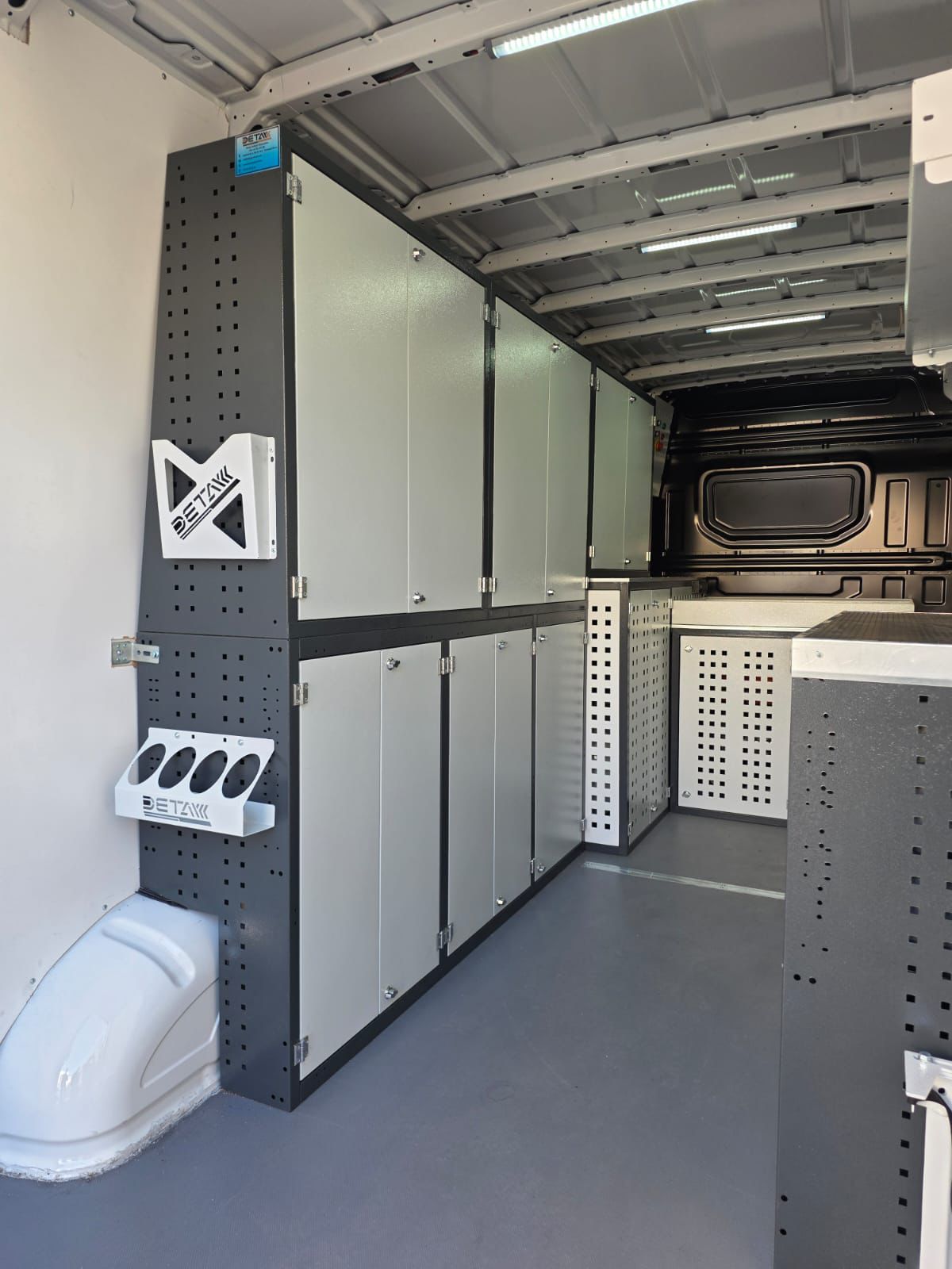 Araç zeminine isteğe göre mdf yada mdf üzeri alüminyum kaplama araç içi duvarlarına alüminyum giydirme dolap ve rafların olduğu bölümde led aydınlatma montajları yapılabilmektedir.