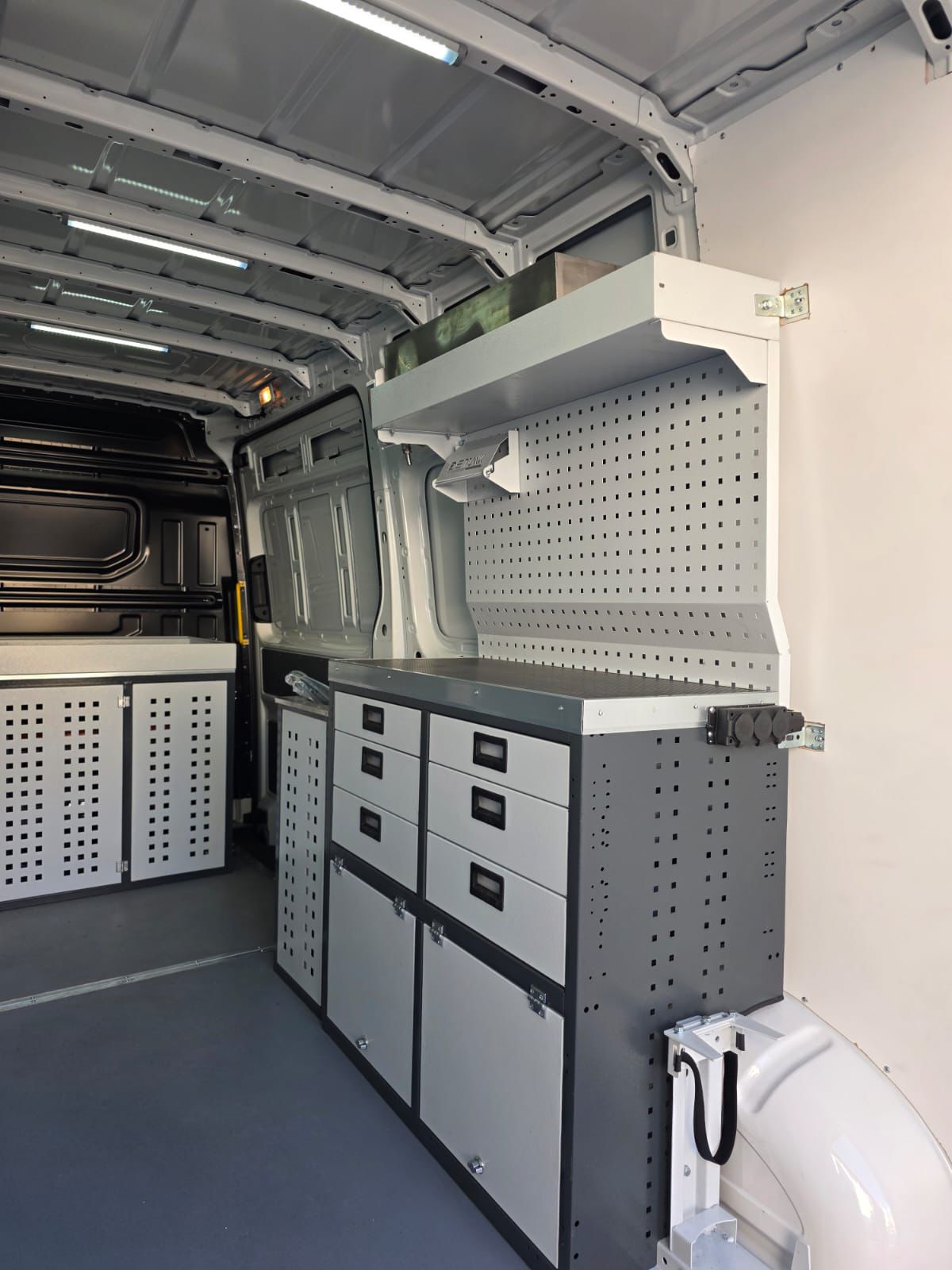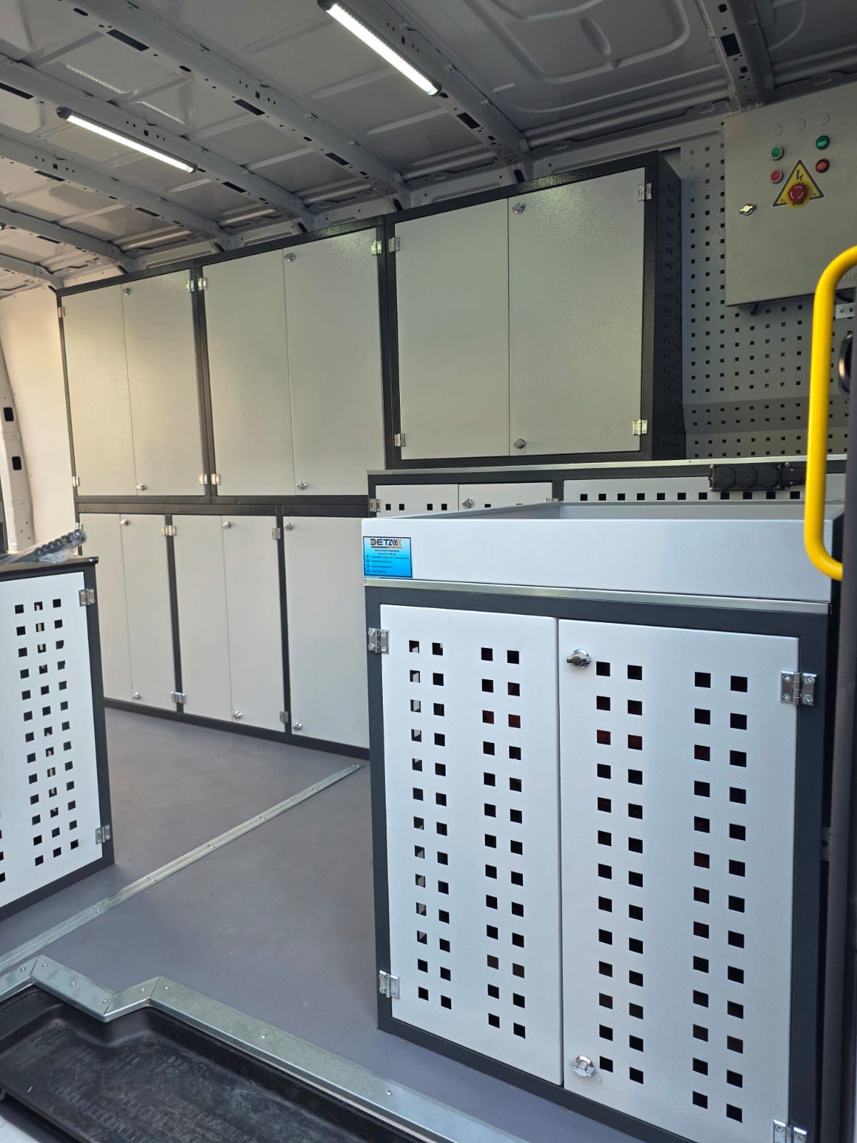 Bakım onarım için kullandığınız Volkswagen Crafter mobil servis aracının iç kısımları modüler raf çekmeceli dolap ve çalışma tezgahları ile donatılarak gezici bir servis aracına bir nevi seyyar atölyeye dönüştürülmektedir.